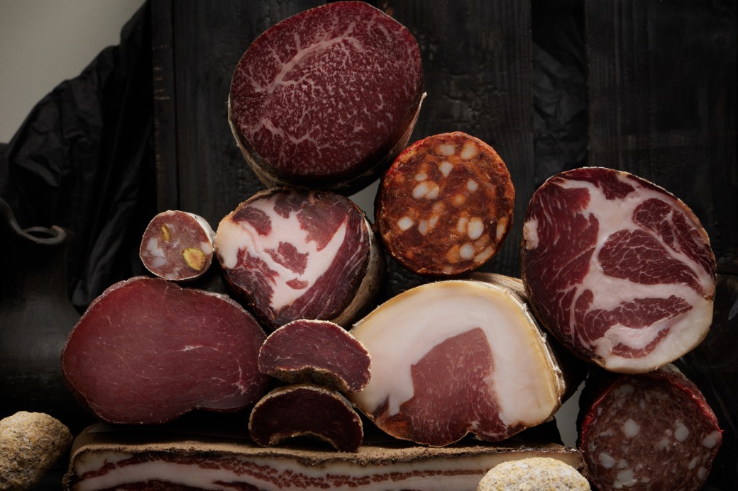 Herb-cured pork belly wrapped in black pepper, offering deep, earthy notes in every slice.